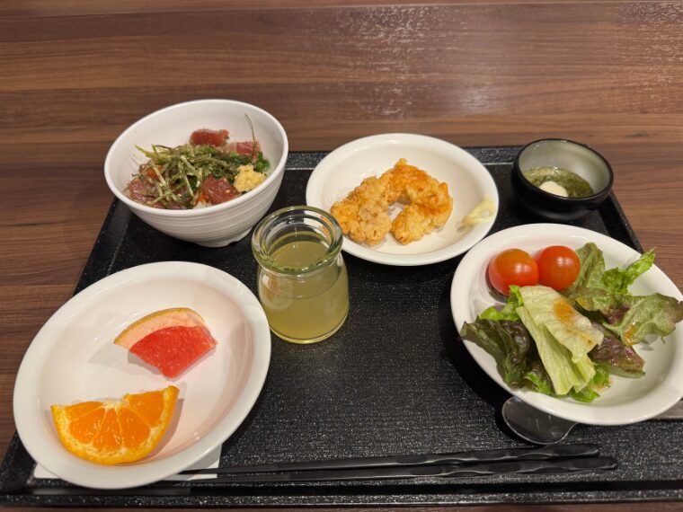 大分名物の、とり天とから揚げを一つずつ、かぼすゼリーも爽やかでおいしかったです。