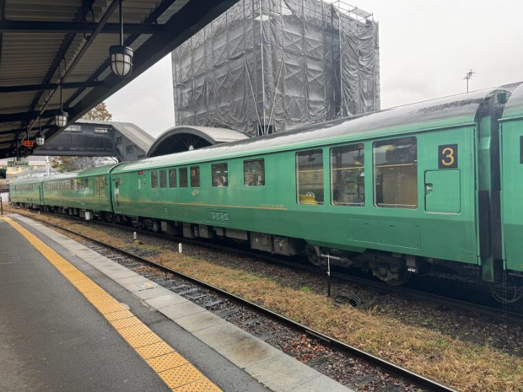 駅のホームに入ると、隣のホームにクルーズトレイン「ななつ星㏌九州」が停まっていました。